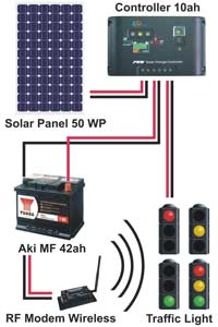Solar traffic light / Lampu lalu lintas tenaga panel surya merupakan solusi akurat untuk mengatasi kemacetan yang disebabkan padamnya lampu lalu lintas akibat terputusnya asupan listrik PLN. Dengan sistem energi solar yang tersimpan dalam baterai, maka Lampu lalu lintas akan tetap menyala tanpa aliran listrik PLN. Dioperasikan menggunakan sistem sensor cahaya dan ultrasonik.