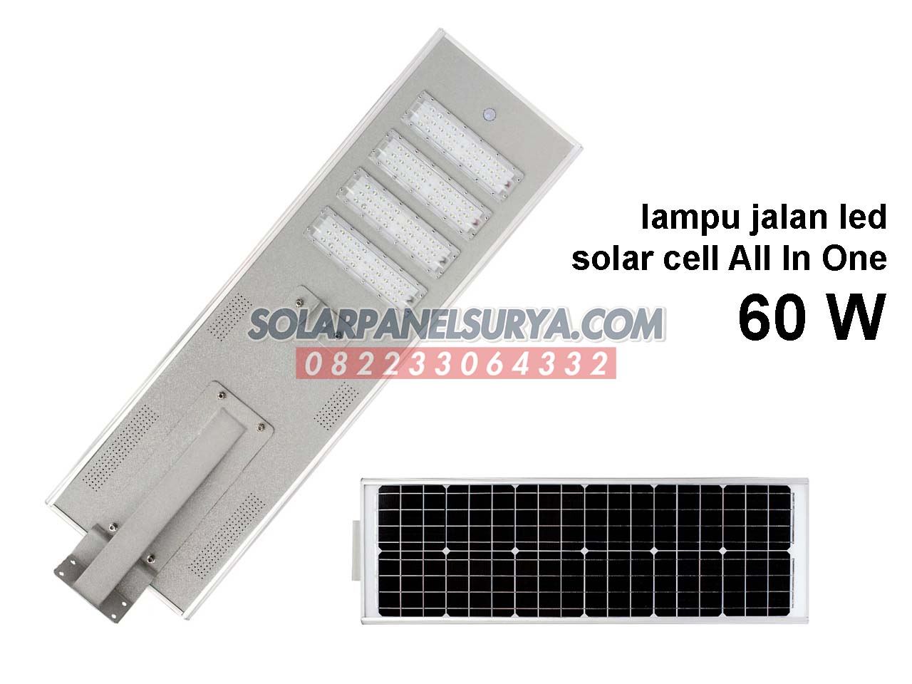 PJU Tenaga Surya 60 watt | PJU Solar Cell | Penerangan Jalan Umum merupakan lampu penerangan yang memanfaatkan tenaga matahari sebagai energi alternatif tenaga listriknya. Solar street light adalah Lampu jalan tenaga surya dibuat systematis, fugsional dan efisien. Lampu Jalan Tenaga Surya ini berbeda seperti pada umumnya atau tipe lampu konvensional. Dimana Modul Panel Surya, aki, box panel pju, controller solarcell, Lampu LED, kabel dll nya yang di pasang terpisah. Komponen Lampu PJU all in one dibuat menjadi satu didalam satu unit kedalam kap lampunya. Dengan sistem pendukung dibuat menjadi satu, membuat terlihat elegan dan rapi dalam pemasangannya. Selain itu elegan lampu pju ini juga tahan terhadap air dan debu sehingga daya tahan menjadi lebih lama serta tidak mengangu kinerja dalam penerangan jalan.